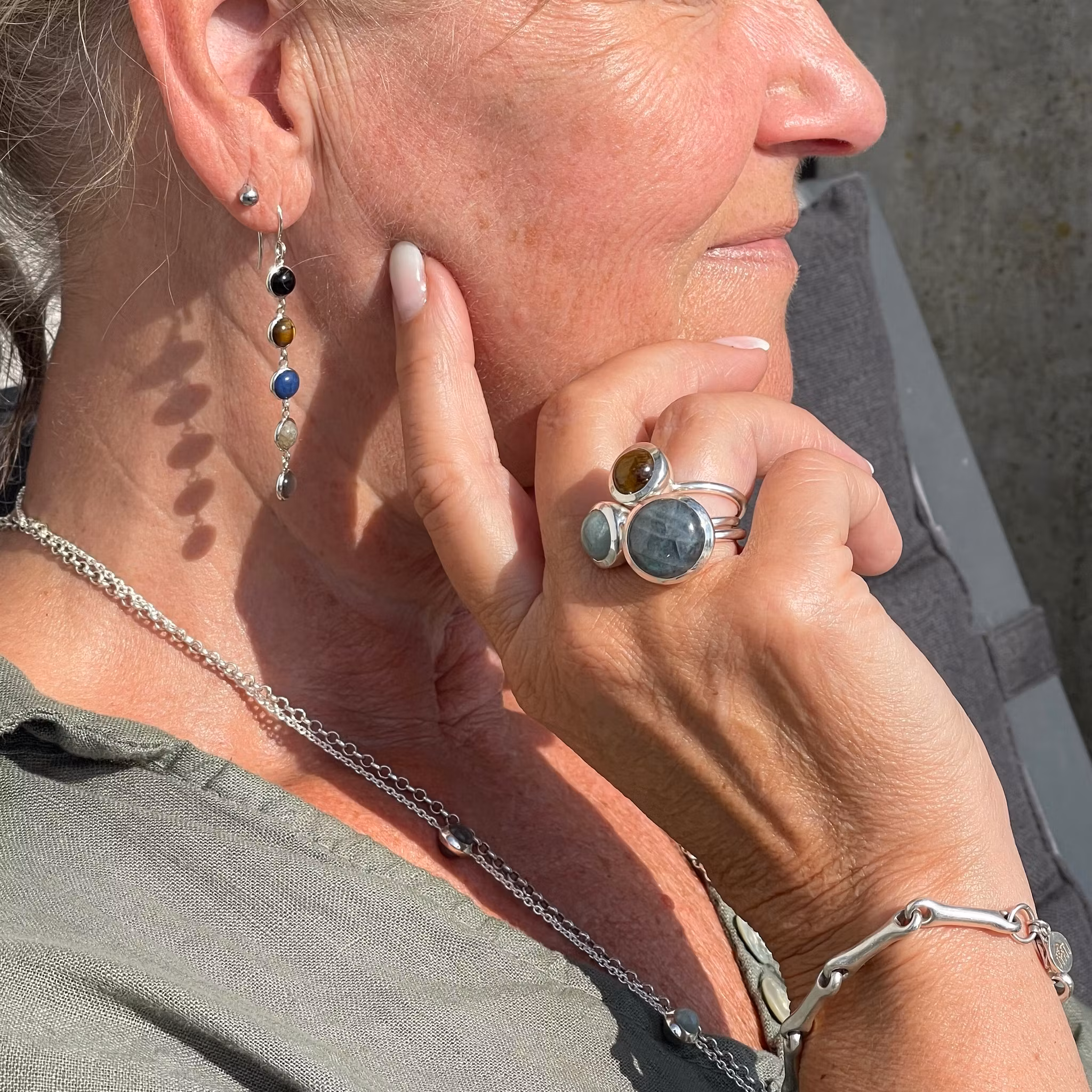 Vackra örhängen med naturliga ädelstenar, en härlig mix av mörka stenar; onyx, grå månsten, tigeröga, labradorit och lapis lazuli. Matchar så klart med resterande smycken i HOLI-kollektionen. Örhängena rör sig vackert då alla stenar är ledade och örhängena är lätta att bära.