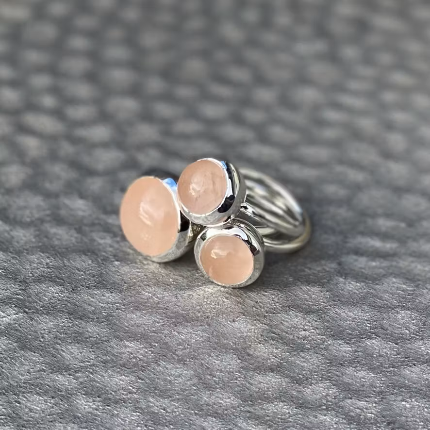 Det finns två olika storlekar på ädelsten att välja på och dessa ringar är med den lilla stenen, här med en vacker rosenkvarts.