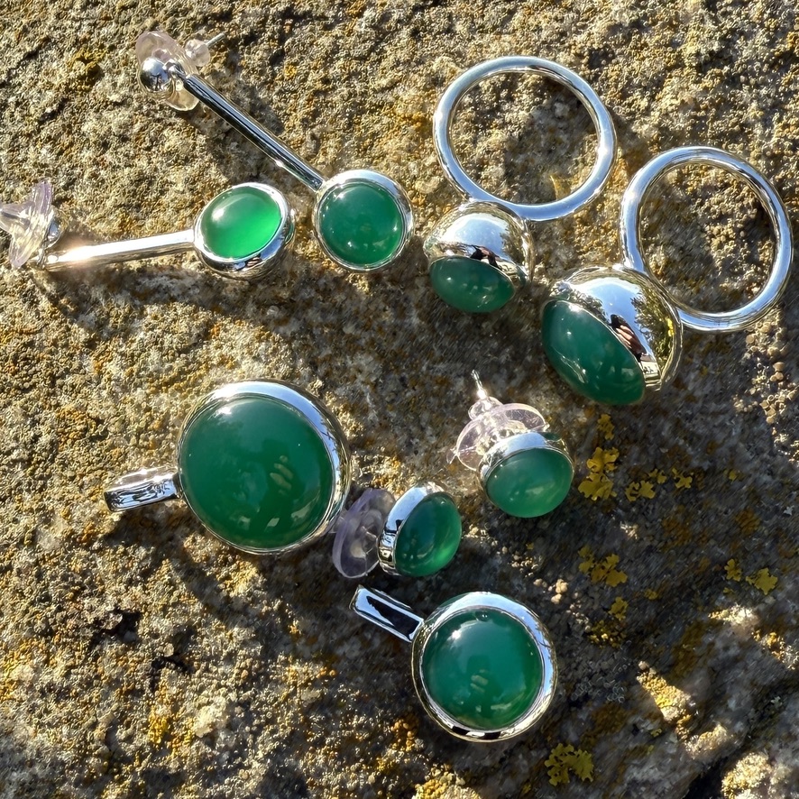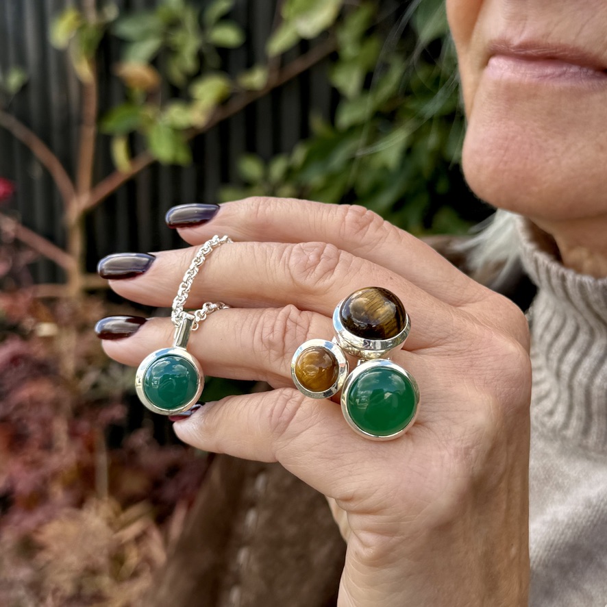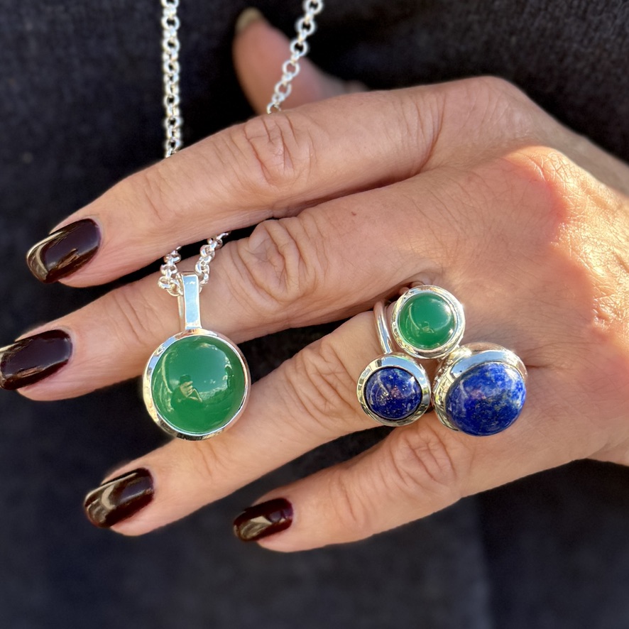 Vi använder naturliga ädelstenar i våra silversmycken som onyx, rosenkvarts, kristallkvarts, tigeröga, labradorit, rökkvarts, akvamarin, kalcedon, regnbågsmånsten, lapis lazuli, prehnit och grå månsten. Förr kallades dessa stenar för halvädelstenar då man från kommersiellt håll ville särskilja dessa från ädelstenar som diamanter, rubiner, smaragder och safirer. Men begreppet halvädelstenar används mindre och mindre idag då dessa stenar kan betinga väldigt höga priser på marknaden i väldigt bra exemplar, och är även starkt efterfrågade. Någon exakt kategorisering mellan ädelstenar och halvädelstenar finns inte, och såväl geologer som gemologer anser därför att även halvädelstenar ska kallas ädelstenar, se Wikipedia. Men ibland kan värdet på en halvädelsten vara högre än på en ädelsten beroende på dispersion, glans och brytningsindex. Alla stenar är olika, även inom samma sort och ingen är den andra lik.