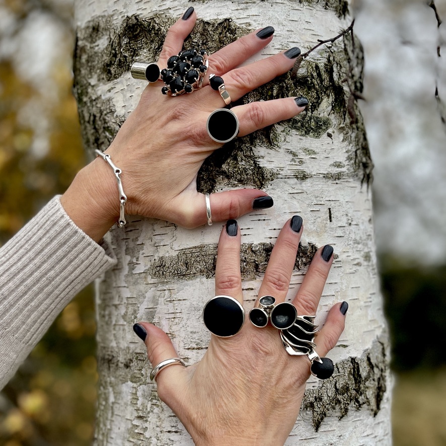Onyxen används oftast blankpolerad i smycken men vi slipar den matt så den nästan ser ut som lakrits. Läs mer om silverringen CLAW med en stor mattslipad Onyx, se mer här.